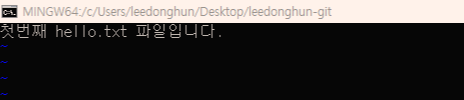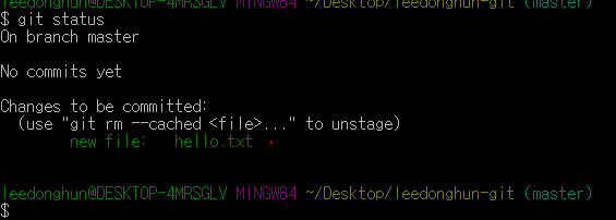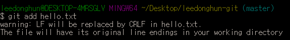 hello.txt라는 파일을 만들어서 작업트리로 쓰려고 했던 leedonghun-git 폴더에 넣어보겠다.