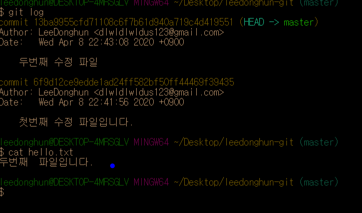 git log 글 보면 '두번째 수정'이란 메세지의 commit이 보이게 된다.