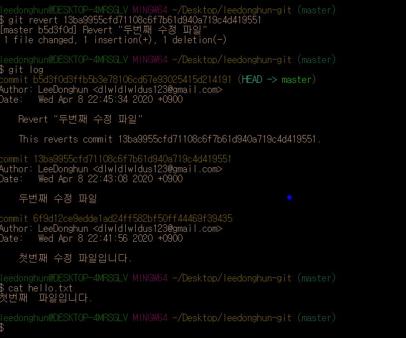 이제 git revert 로 '두번째 수정 파일' 이 삭제 되지 않고, '첫번째 수정 파일입니다.'으로