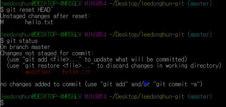 'git reset HEAD 파일이름'은 스테이징 바로 전 단계로만 돌아갔음을 알수 있다.
