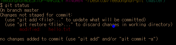 git status 를 다시 확인해보니, hello.txt 파일의 상태가 changes not staged for commit으로