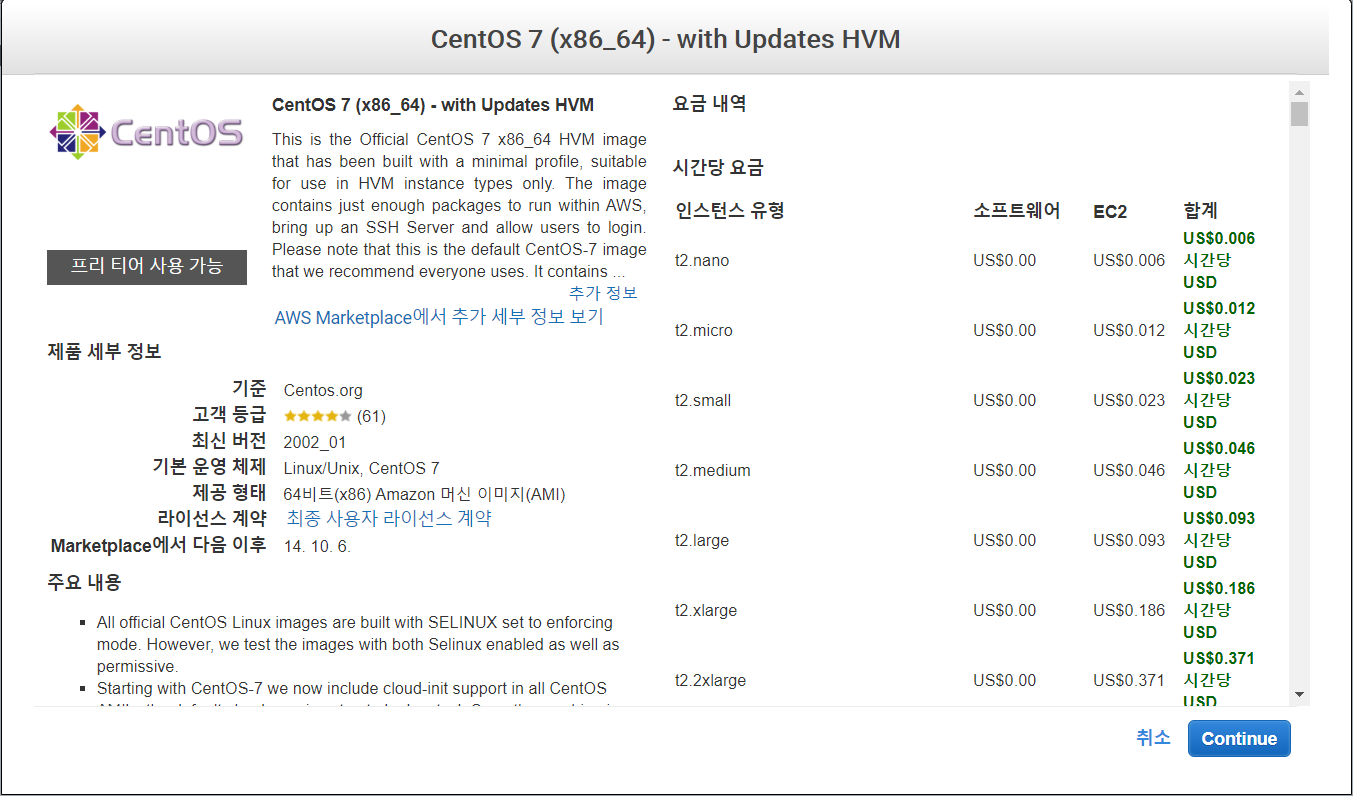 저같은 경우에는 프리티어 유저가 사용 가능한 centos7을 선택했습니다.