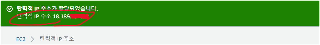 13. 할당 버튼을 누르면 아래와 같이 탄력적 ip가 할당되었음이 알려집니다.