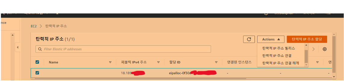 이중, 탄력적 ip 주소 연결을 클릭해 줍니다.