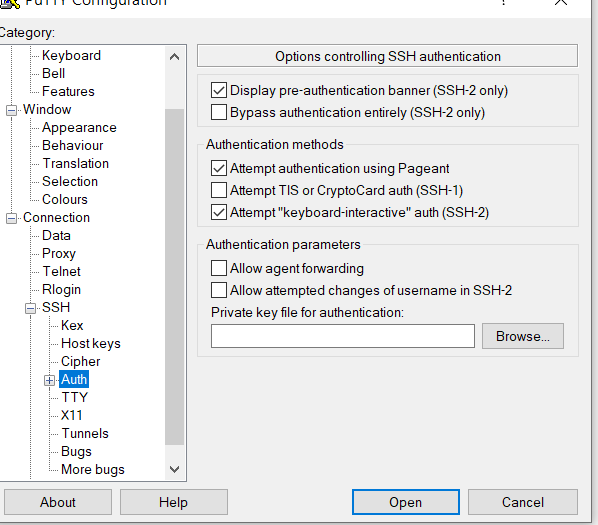 SSH 하위 목록중에 Auth가 있는데 이를 클릭하면, 인증을 위해 private key를 넣는 칸이 있습나다.