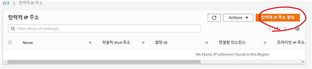 11. 들어가면,아래와 같은 사진이 보여지는데 '탄력적 IP주소 할당' 버튼을 클릭해줍니다