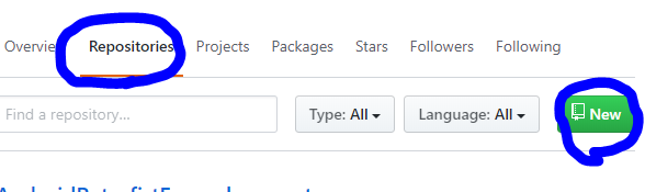 6. Git-hub에 로그인 후, Repositories 탭을 눌러주면, New 버튼이 보입니다.