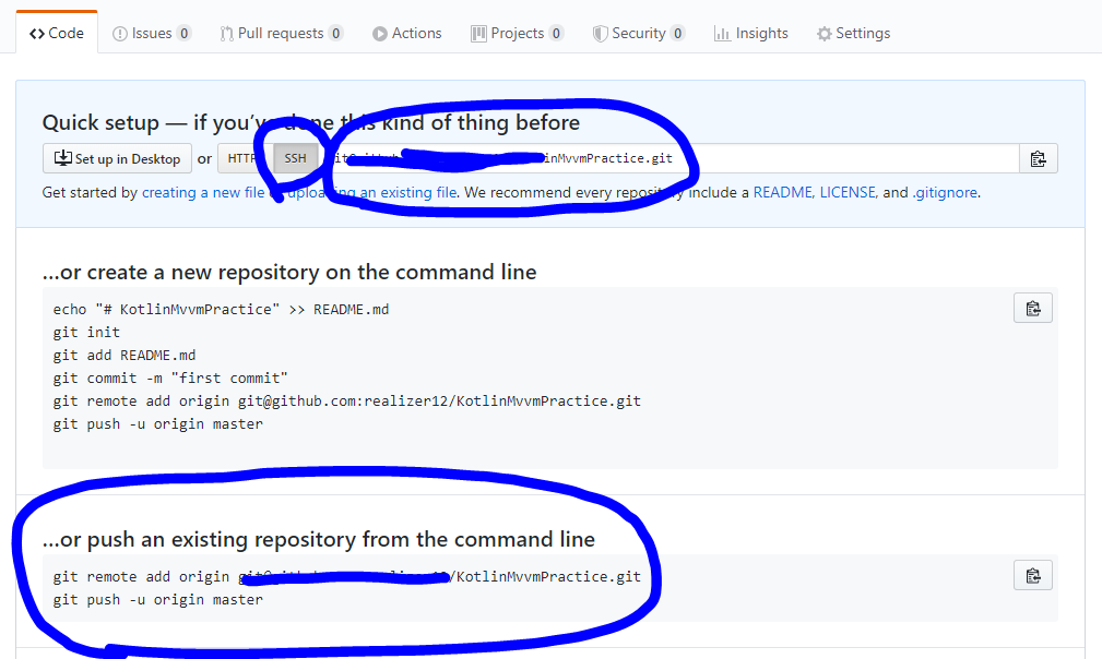맨 아래 동그라미친 기존 존재하는 or push an existing repository from the command line