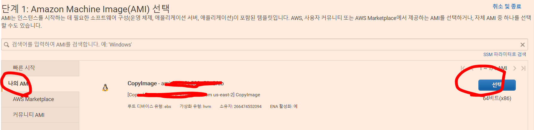 9. 그리고 "나의 AMI"로 들어가 방금 복사한 AMI를 선택한다.