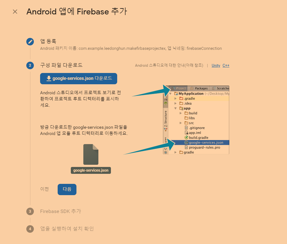 해당 버튼 누르면 google-services.json 파일이 다운로드 되는데,