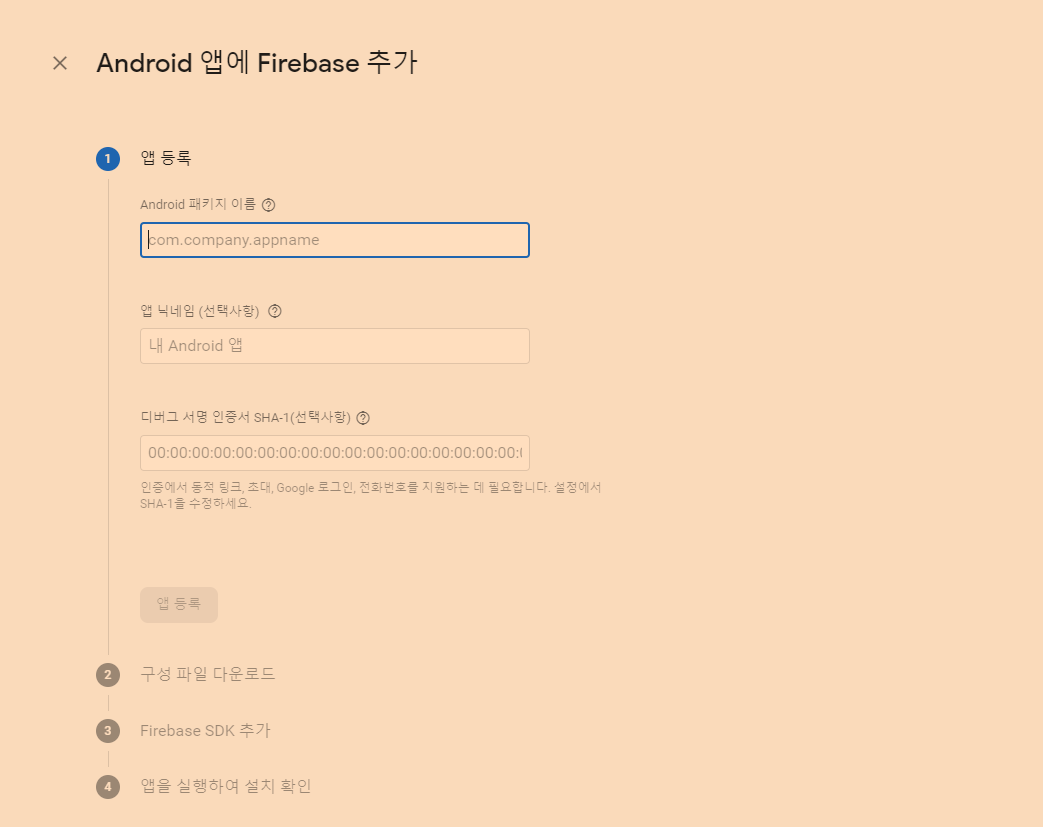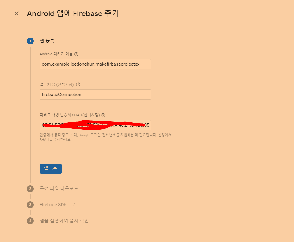 6.연결할 안드로이드 패키지 이름 넣어주고 앱 닉네임 만들었는데